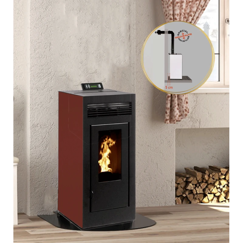 Ce poêle présente une sortie par les fumées par le dessus au lieu d’une sortie par l’arrière.